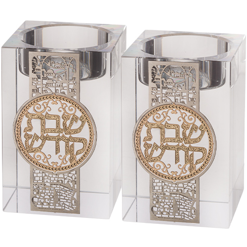 / זוג פמוטי קריסטל מרובע עם פלקטה "ירושלים" 8 ס"מ