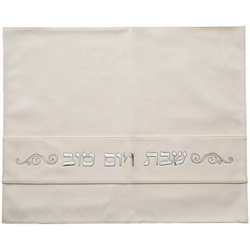 203 כיסוי חלה מהודר דמוי עור לבן וכסף עם הבלטות 45×55 ס"מ