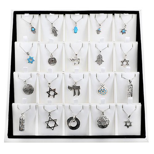 Display Of 20 Assorted Judaica Pendants דגמים שונים,כולל מתקן תצוגה