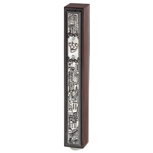 בית מזוזה מעץ ונגה עם פלקטה "ירושלים" 12 ס"מ