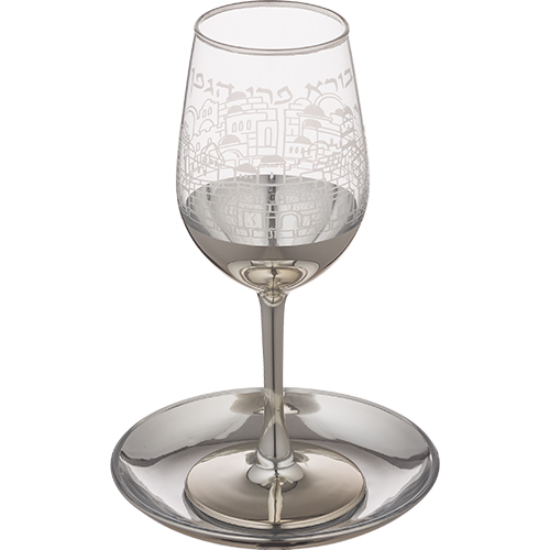 / גביע קידוש זכוכית שקוף וכסף "ירושלים" 21 ס"מ