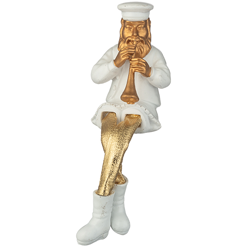חסיד יושב מפוליריזן לבן עם רגלי בד זהב 25 ס"מ מנגן בקלרינט