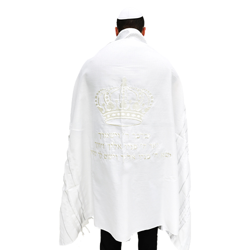 טלית "מופת" חתנים גודל 70 – 185×150 ס"מ פסים כסף ריקמה כתר