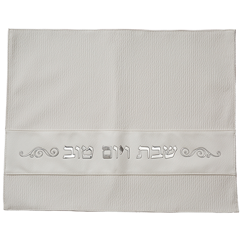 כיסוי חלה מהודר דמוי עור לבן וכסף עם הבלטות 42×52 ס"מ