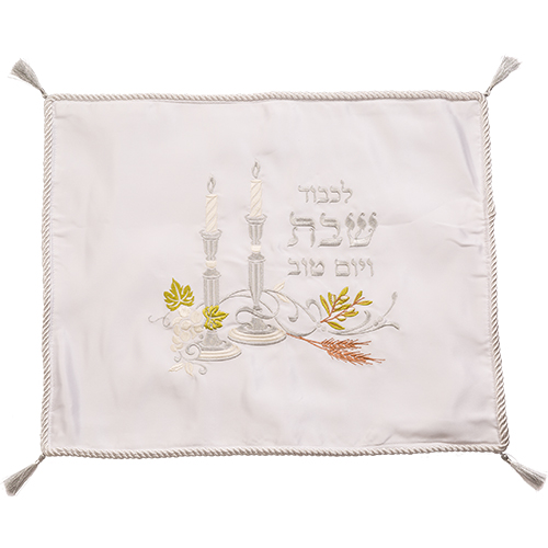 כיסוי חלה לבן מסטן עם ריקמה מהודרת 42×52 ס"מ