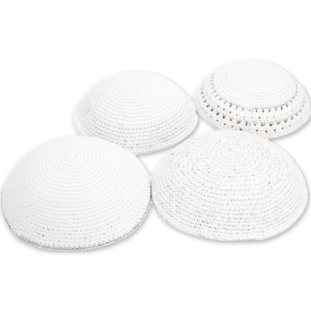 כמות של כיפה סרוגה דגמים מעורבים - לבן עם כסף - 16 ס"מ - 24 יח