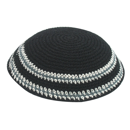 כיפה סרוגה שחור מסביב פסים אפורים ולבנים 17 ס"מ