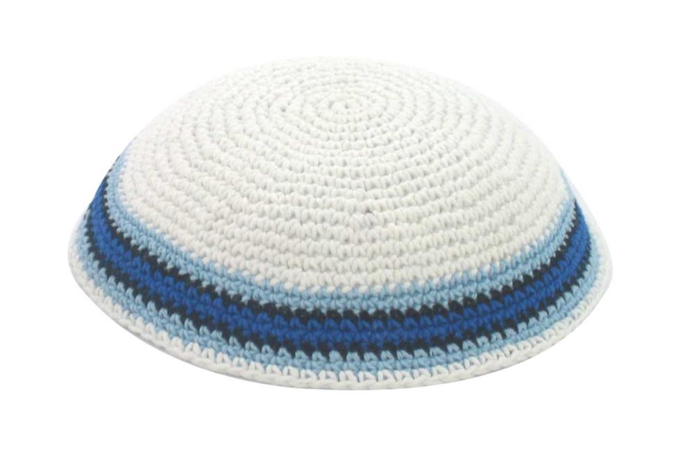 כיפה סרוגה 15 ס"מ לבנה עיטור פסים כחול תכלת ושחור מסביב