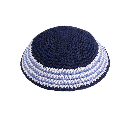 כיפה סרוגה 16 ס"מ בצבע כחול כהה מסביב פסים בכחול