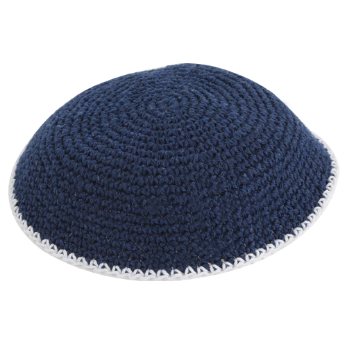 כיפה סרוגה 16 ס"מ בצבע כחול כהה מסביב פס לבן