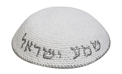 כיפה סרוגה 16 ס"מ לבן עם ריקמה "שמע ישראל" כסף