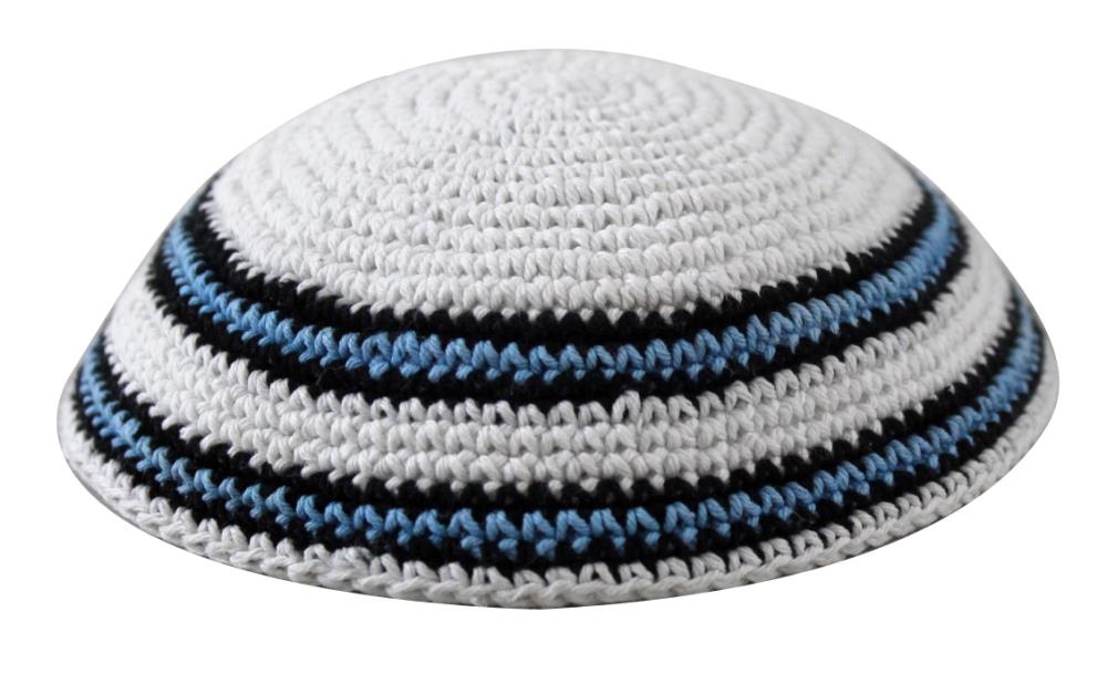 KNITTED KIPPAH 16 CM- WHITE WITH BLUE-BLACK STRIPES