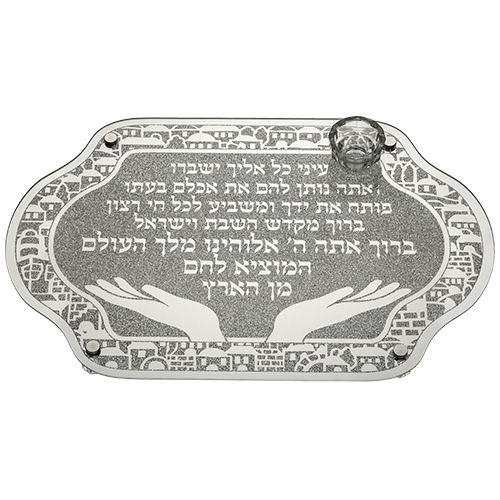 מגש חלה מהודר מזכוכית עם מלחייה כיתוב פותח את ידך 45X30 ס"מ