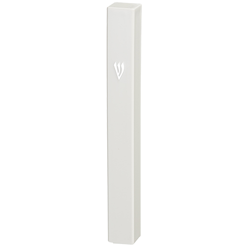 מזוזה פלסטיק לבנה 15 ס"מ "ש" כסף עם פקק גומי