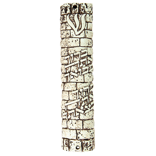 מזוזת פוליריזן דמוי אבן בגוון חום 20 ס"מ "ברוך בבואך ובצאתך" עם פקק גומי