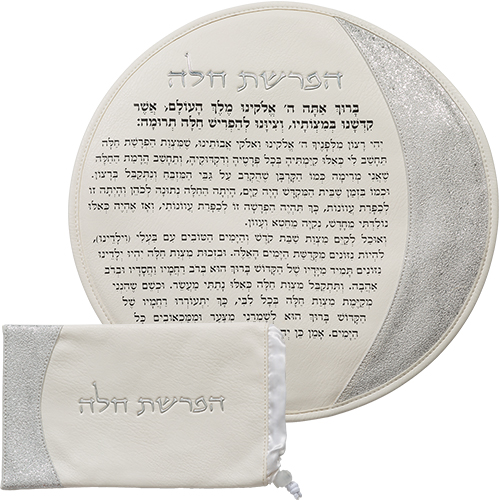 סט הפרשת חלה דמוי עור לבן "אותיות בולטות" כסף 40 ס"מ