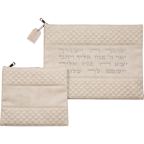 סט טלית תפילין דמוי עור אפור אותיות בולטות "יברכך" כסף 31*38 ס"מ