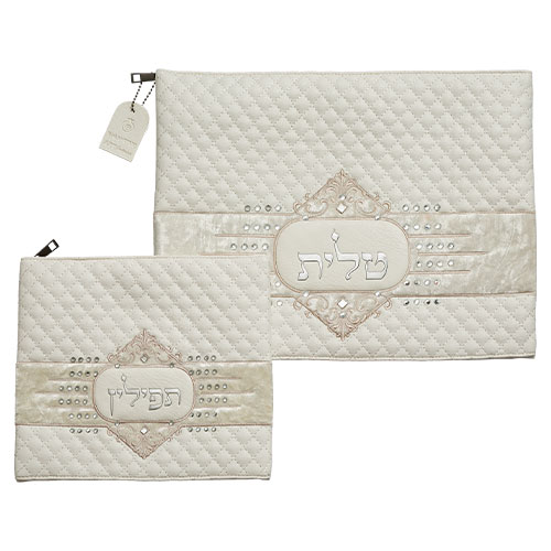 סט טלית תפילין דמוי עור לבן אותיות בולטות כסף 36*29 ס"מ