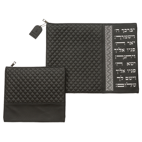 סט טלית תפילין דמוי עור שחור אותיות בולטות "ויברכך" כסף 36×29 ס"מ