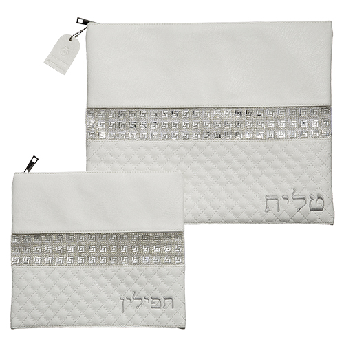 *סט טלית תפילין לבן דמוי עור עם ריקמה ואבנ