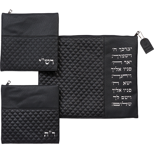 [סט טלית תפילין דמוי עור שחור אותיות בולטות "ויברכך" זהב 36*29 ס"מ