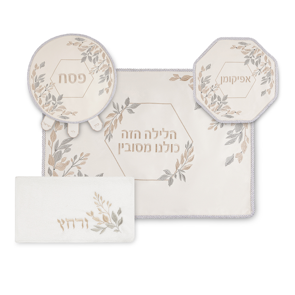 סט פסח 4 חלקים פיו לבן עם רקמה, אבנים עלים