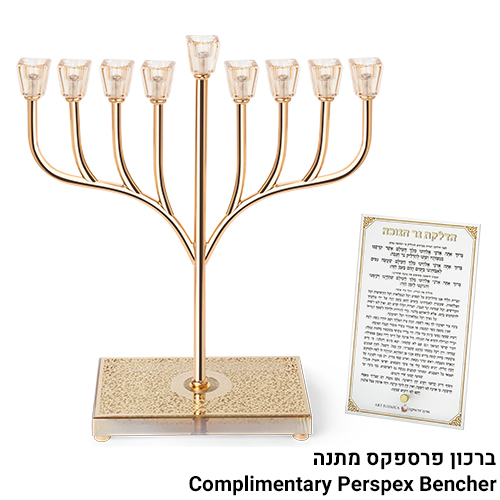 פריץ חנוכיה מתכת זהב עם בסיס קריסטל ופלקטה 37סמ