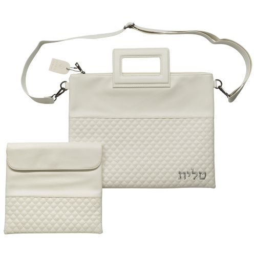 PU Fabric Talit & Tefilin Set 38*31 cm – White with Embossed logo כיסוי פלסטיק PVC